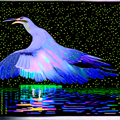 Swan flying over a lake at night. Stars shining brightly, bird singing a happy song.